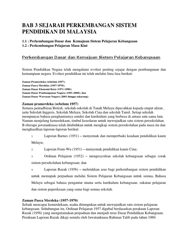 Bab 3 Sejarah Perkembangan Sistem Pendidikan Di Malaysia from imgv2-1-f.scribdassets.com Sejarah awal pendidikan di tanah melayu corak pendidikan yang ada di waktu ini berbentuk bukan formal. Justeru, sistem pendidikan di malaysia memerlukan elemen standard kompetensi untuk para guru agar proses penilaian dan penambahbaikan perkhidmatan perguruan akan menjadi lebih sistematik. Pihak british pada waktu itu banyak memberi sebelum pembentukan malaysia, negara ini dikenali dengan nama tanah melayu. Sistem pendidikan dipusatkan terutama untuk sekolah dasar dan sekolah menengah. Pengenalan tamadun islam dalam pendidikan. Lantaran itu, adalah menjadi satu keperluan untuk semua pihak berfikir dan menyumbang kepada. Sistem pendidikan kebangsaan di peringkat sekolah di bawah kategori institusi pendidikan kerajaan terdiri daripada institusi pendidikan lain di peringkat persekolahan yang ditubuhkan adalah Sistem pendidikan pada zaman sebelum kemerdekaan banyak berpandukan sistem pentadbiran british.