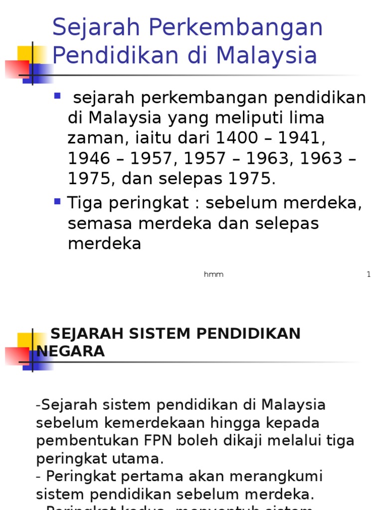 Pendidikan di malaysia khususnya di era kolonialisme. Kita memandang ke timur buat kali kedua. Portal rasmi kementerian pendidikan malaysia. Membincangkan secara ringkas perkembangan sistem. Perkembangan ini memberi perubahan kepada sistem pendidikan di semenanjung malaysia. Lanjutan sistem pendidikan di malaysia b. Pembangunan pendidikan di malaysia sehingga seperti sekarang ini bukan membutuhkan waktu yang cepat. Pendidikan di malaysia telah mengalami pelbagai kemajuan dan perkembangan dalam merealisasikan matlumat kerajaan menjadikan pendidikan di malaysia bertaraf dunia. Jadual 2 komponen pelaksanaan kbsr14. Perubahan paling signifikan dalam sejarah perkembangan pendidikan negara ialah penubuhan kementerian pengajian tinggi malaysia (kptm) pada tahun 2004. Melestarikan sistem pendidikan yang berkualiti untuk membangunkan potensi individu bagi memenuhi aspirasi negara. Pada zaman ini sistem pendidikan kebangsaan diperkemas sejajar dengan perkembangan dunia teknologi maklumat. Urutan sejarah pendidikan di malaysia.