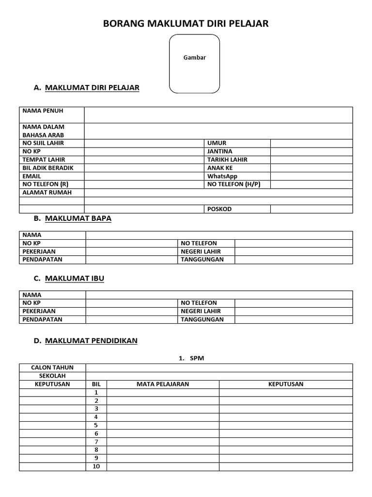 Borang maklumat diri dan pengenalan wakaf. Poskod bandar negeri borang maklumat murid modul pengurusan murid, sistem pengurusan sekolah kementerian pendidikan malaysia (hari) (bulan) (tahun) warganegara (hari) (bulan) (tahun) perempuan lelaki poskod. Maklumat diri online worksheet for pendidikan khas. Senarai semak permohonan penempatan pegawai perubatan (lantikan baru). Maklumat pemohon nama pemohon :