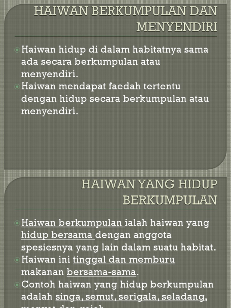 (lipan, semut, kerbau, singa, tikus, lipas, kuda belang dan harimau) 2. Read this essay on haiwan hidup berkumpulan. Jom kenali haiwan yang hidup secara berkumpulanapakah kelebihan dan kekurangannya? Haiwan ini melakukan segala aktiviti bersendirian. Tapir aktif mencari makanan pada waktu malam.