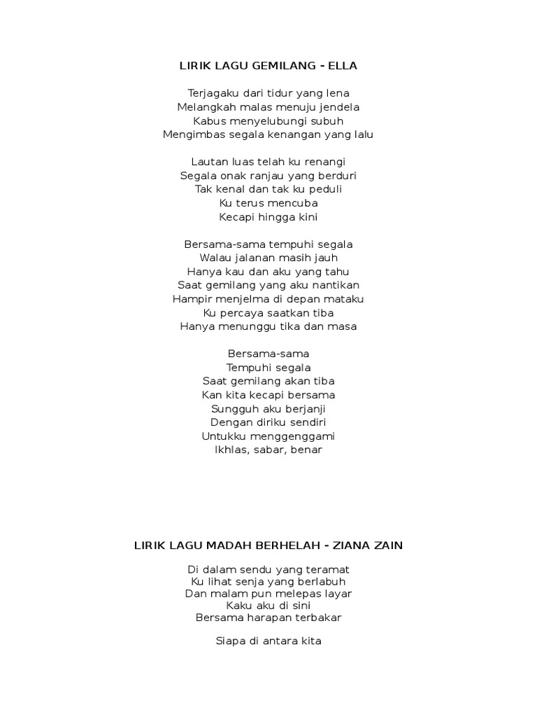 Lembaran Kerja Pendidikan Moral Thn 6 from image.slidesharecdn.com Lirik lagu kadet remaja sekolah (krs) kadet remaja sekolah menuju satu ikatan bersaudara bersatu menjulang keamanan negara menj. Best rock wanita malaysia lagu rock malaysia 80an 90an full album vol 1. Download and listen online gemilang by ella malaysia. Download mp3 ella gemilang lirik dan video mp4 gratis. Simple cz diy 19 july 2020. Lagu ella lagu mp3 download from mp3 ssx last update jun 2021. Ada 20 lagu ella gemilang karaoke klik salah satu untuk download lagu. 16 december 2019 / akhi syafie amiruddin.